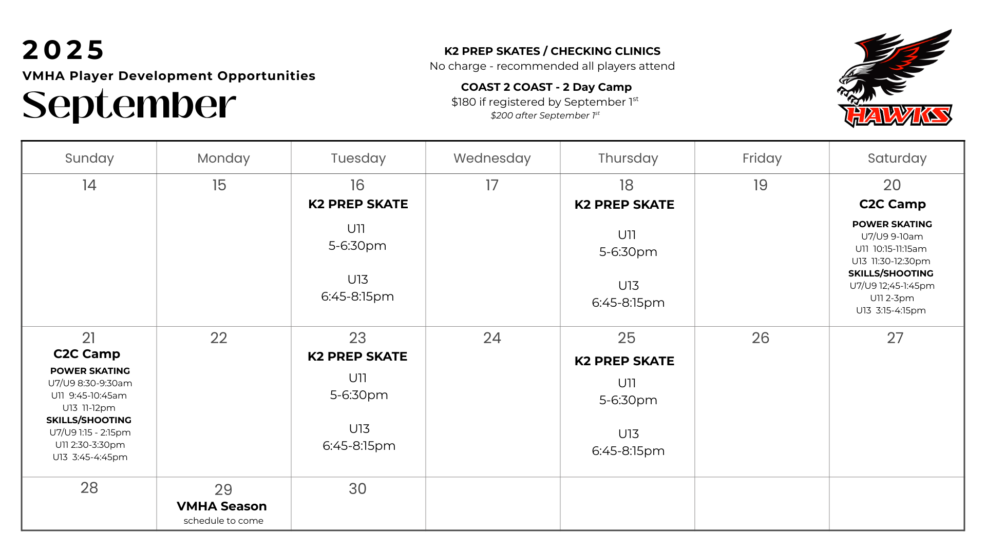 As the hockey season draws near we would like to invite everyone to our pre-season camp, similar to what we have hosted in previous years for all age groups (U7/U9, U11 & U13).